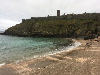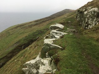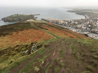 I followed the path on the lower reaches of the eastern side of the hill, which brings you out toward the middle of the range of hills. I continued left towards Corrin Tower which was shrouded in mist. As I reached the far end of the hummocks, I was lucky to get a view towards Glen Maye and beyond. I then turned back along the western lower route eventually joining the main path which leads across the top of the hills down to the Castle
