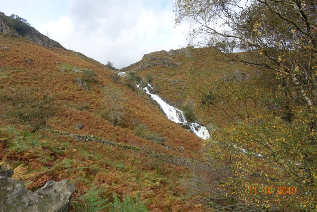 The waterfall looked magnificent, cutting its way through the craggy rocks. We have had so much rain this autumn that even the smaller waterfalls look and sound happy. The colours of the bracken against the slate rocks was striking too.
