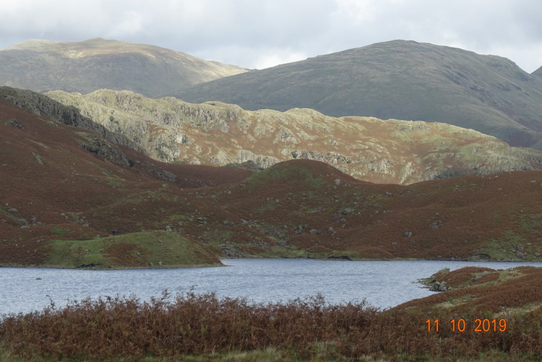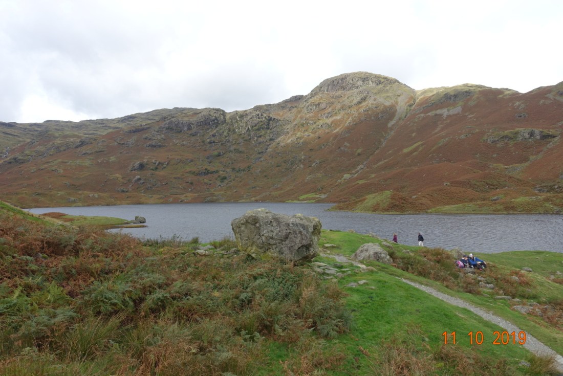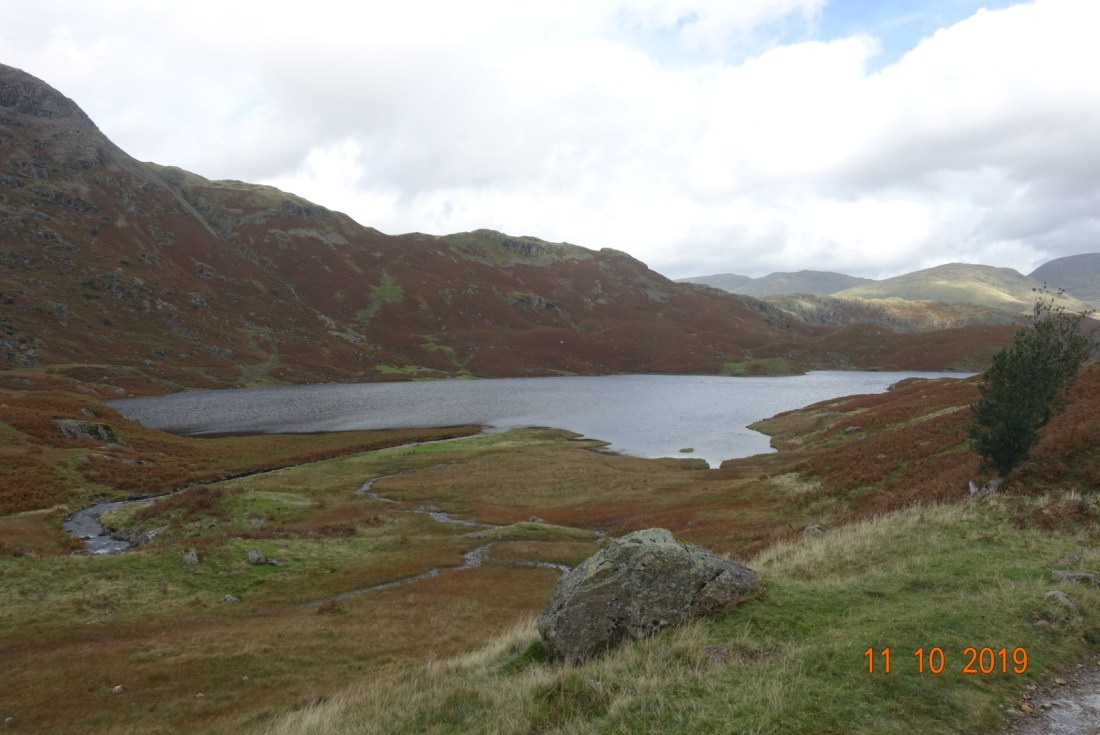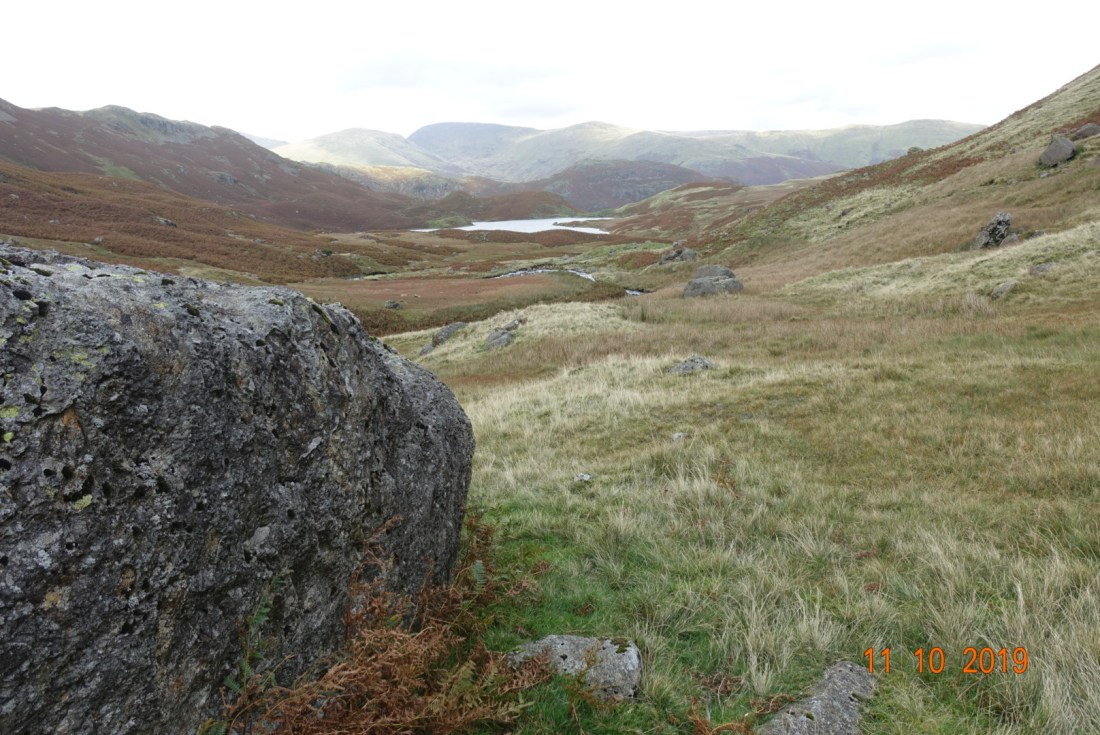 The crags on the northerly edge of the tarn as seen in the first photo above and the seconds below are Tarn Crag (the steep headwall of the former glacier), Greathead Crag, Stenners Crag, and immediately above the stepping stones, Cockley Crag. Tarn Crag of volcanic lapilli-tuff and volcaniclasic sandstones would have been the top end of the glacier, and the terrain around the stepping stones are hummocky moraine. If you are walking up there, you might see some mounds of craggy rocks on the one side and a smooth surface on the other. These are known as ‘Roche’s Moutonnée’. Every now and again you come across erratics left by the glaciers as in the photo below: