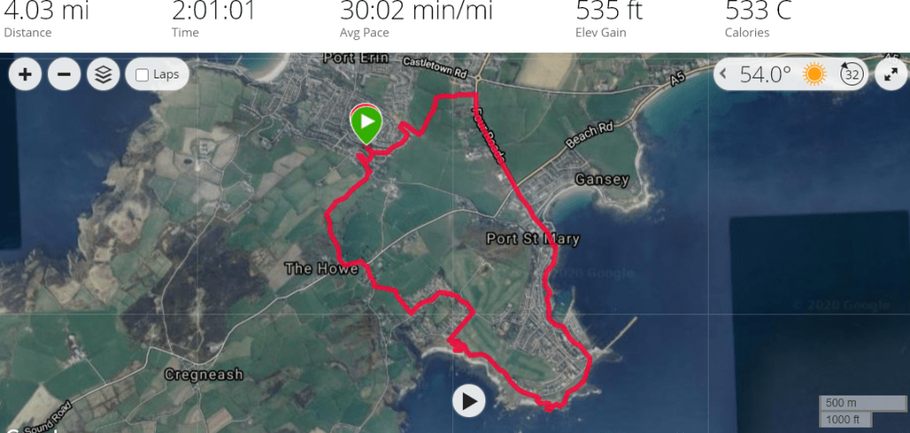 Once I finished messing about on the beach, it was a matter of strolling home along the outskirts of Port St Mary, taking the underway as far as I could – it is one way to allow social distancing, in the opposite direction to one that I was walking – then following the main road to Four Roads before veering left down the lane and footpaths over the fields back to Port Erin.