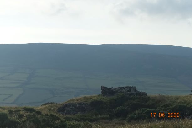 We were bundled into cars to our starting point just up the road. From then on we followed a recognised footpath until we turned off into a field to go on the western side of Slieau Ree and view Joe’s Lewin’s Tower, or at least what remains of it, which isn’t much – just a spiral ramp and a couple of feet of vertical stone. He is reputed to be an eccentric who built this for the fun of it, or to be close to God. Either way, it does have fantastic views towards Douglas and the Baldwin valley… and the sky! Another document records this as originally a limestone kiln. You can choose which you prefer to believe. Both are quite possible, as this valley housed the Ohio mine for lead, silver, copper and zinc. (Sadly 8 miners were killed in a gas explosion here).