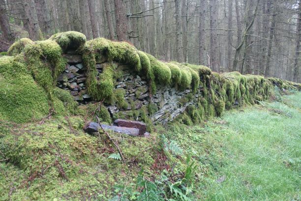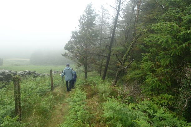 On coming out of the forest, you come to a clearing with what would be really nice views of the moorland hills above Glen Helen. But today, we could only see a few hundred yards, and as we reached the cairn, our highest point of the day, we could barely see a thing and there was a howling gale wrapping around us. Thankfully, we were not on exposed ground for very long, and the path goes alongside the outer rim of the southern slopes of the hill and then steeply downhill. It is definitely best to walk this route the way we did, otherwise you would have quite a steep climb to the top without many resting places. The walking poles were useful for keeping our balance on some slippery downhill parts.