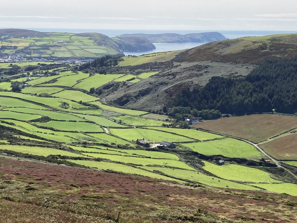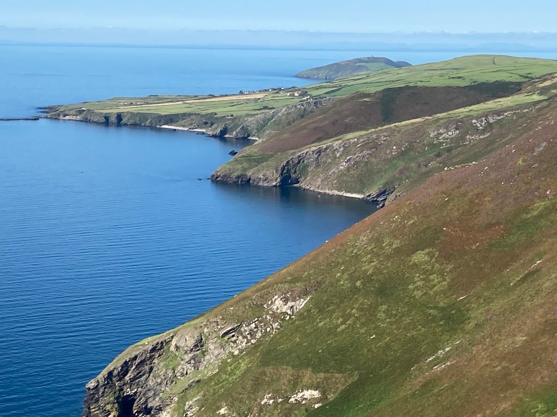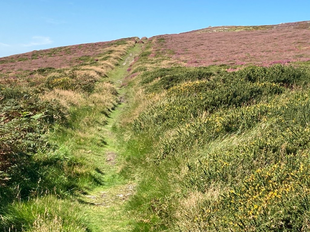 The heather and gorse were out displaying a wonderful variety of pinks, purples and yellows, but not quite as dramatic and colourful as other years. The bees and butterflies were out in abundance, buzzing and flittering around the heather. This section of the walk is one of my favourite places on the whole island. There are a few rises and dips in the terrain and a handy cairn stopping point for lunch, before a steady walk along the top to the highest point with a dramatic cairn and the wonderful title of Lhiatteeny Beinnee (301 metres), which translates as ‘side of the summits’. This seems slightly odd as this is the highest point and the slope that follows down to the Sloc is called Gob ny Beinn, which translates as ‘point of the summits’. But what a view of Naribyl and Peel.