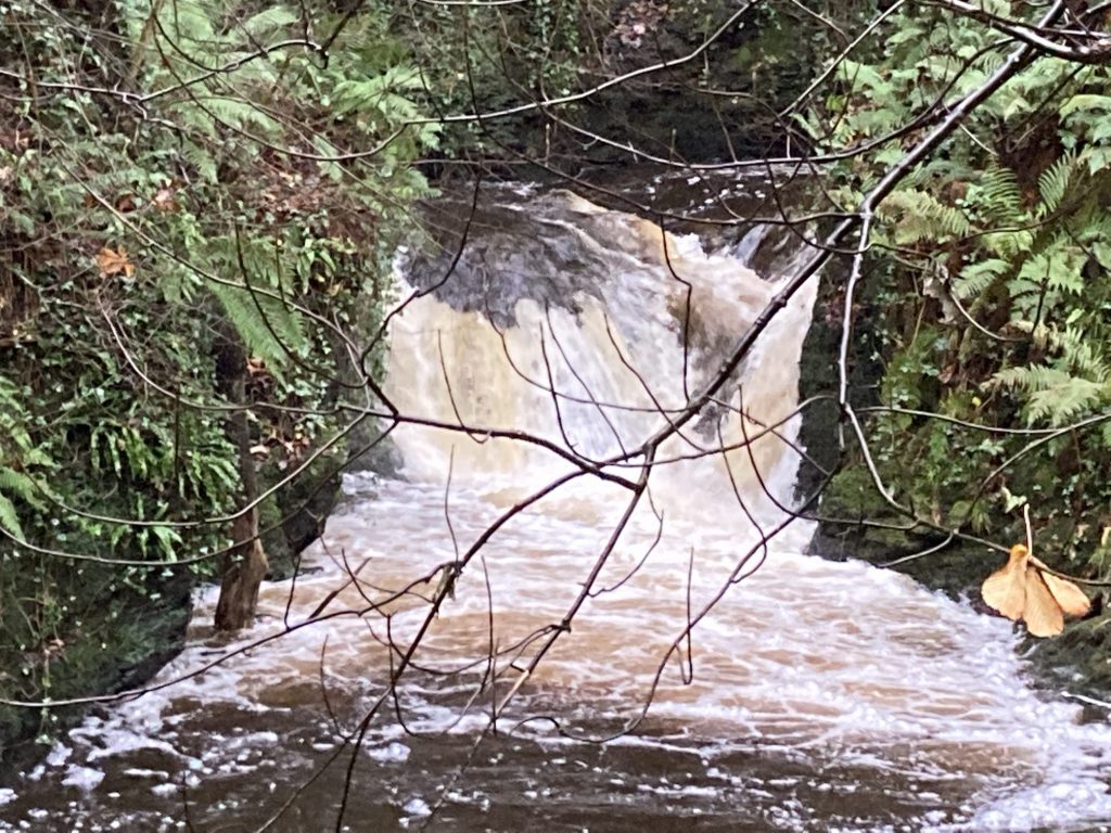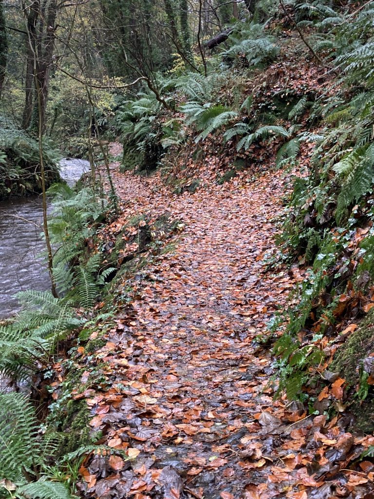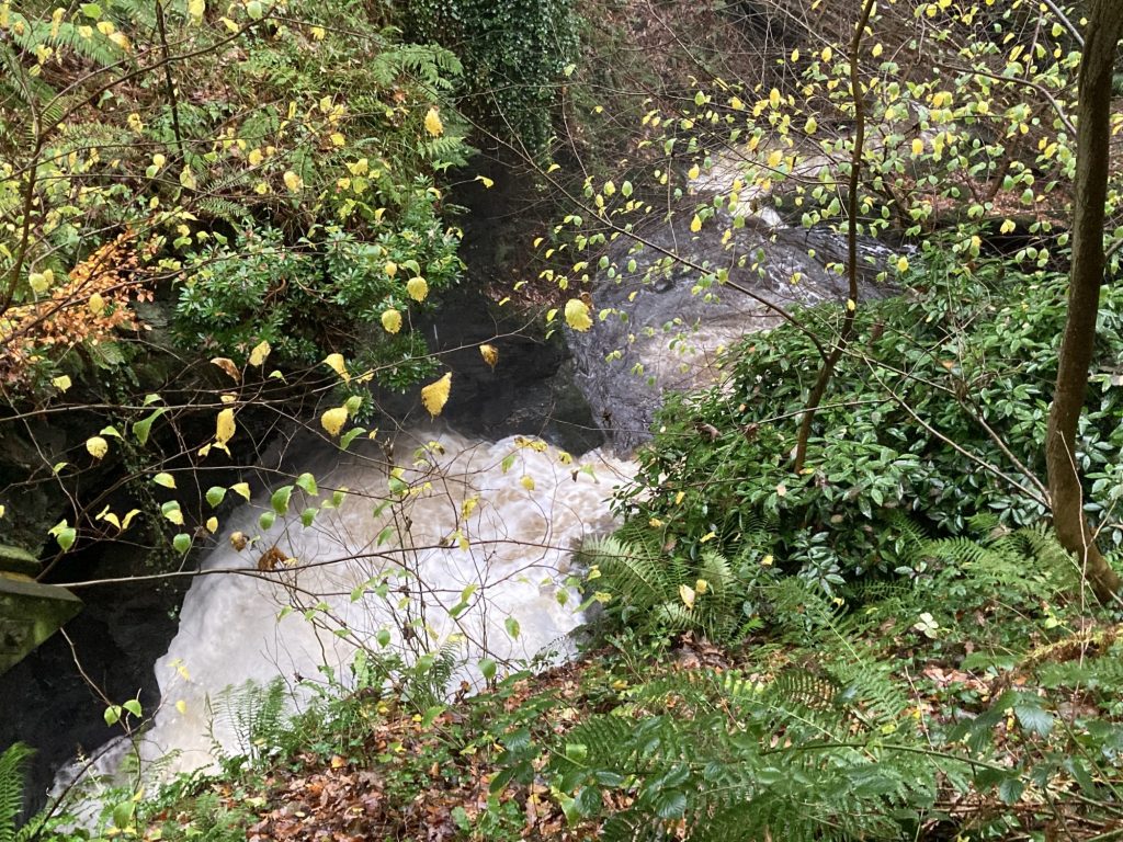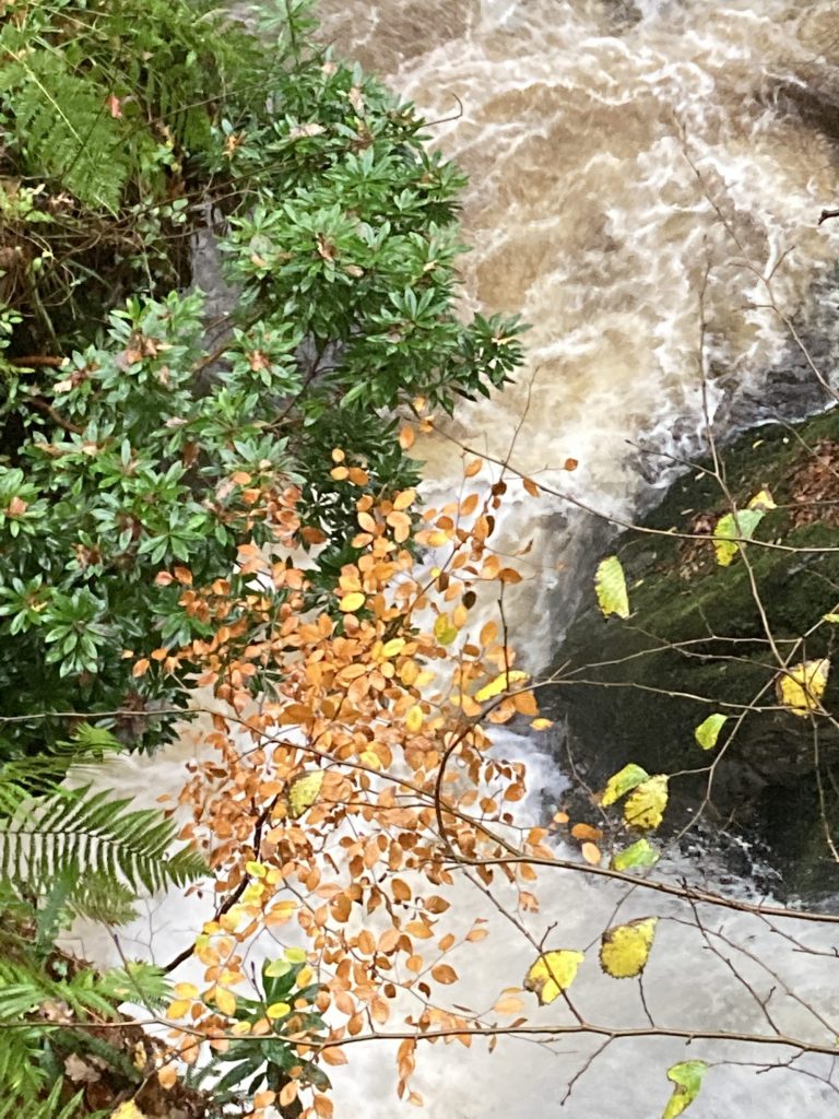 It really was raining cats and dogs and I suspected the paths and steps would be very slippery, especially as they would be strewn with autumn leaves, so rather than take the direct route into the glen I took the road that bypasses the main beauty spot and takes you towards the beach. Even this was tricky to negotiate in places with massive puddles and streamlets meandering down the road.