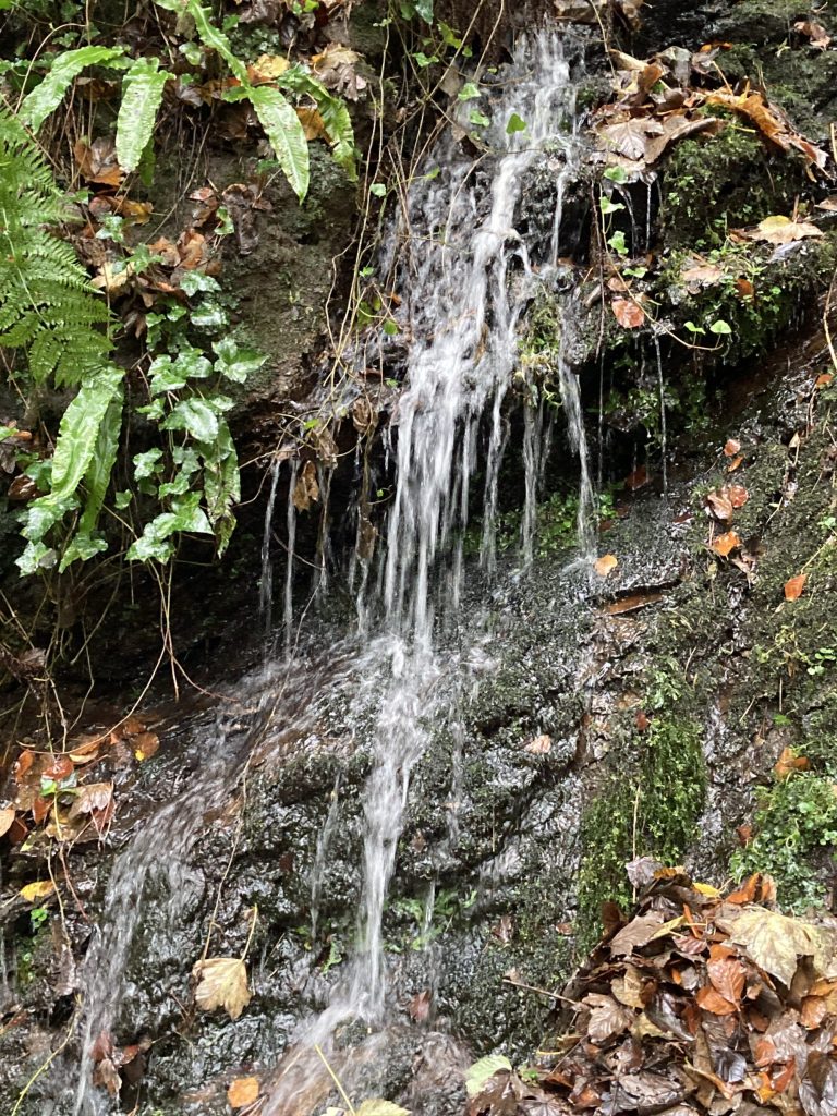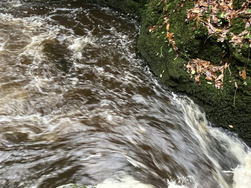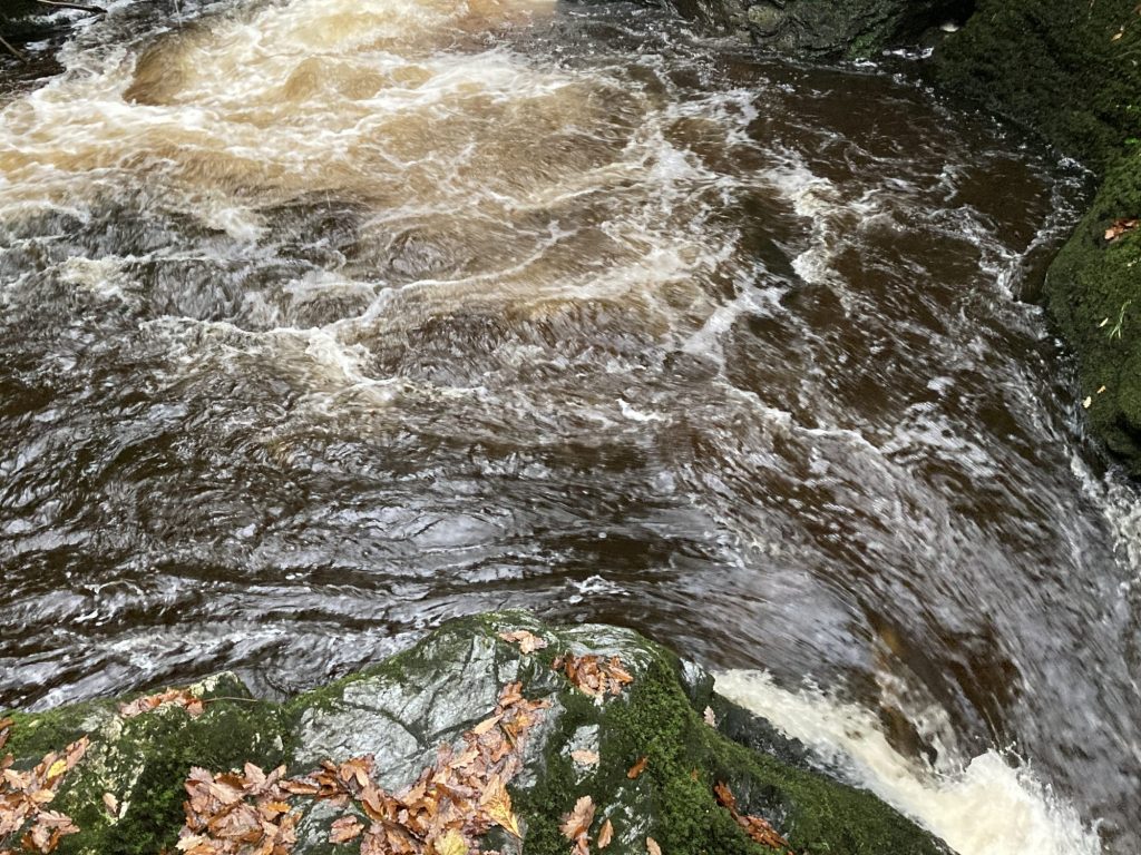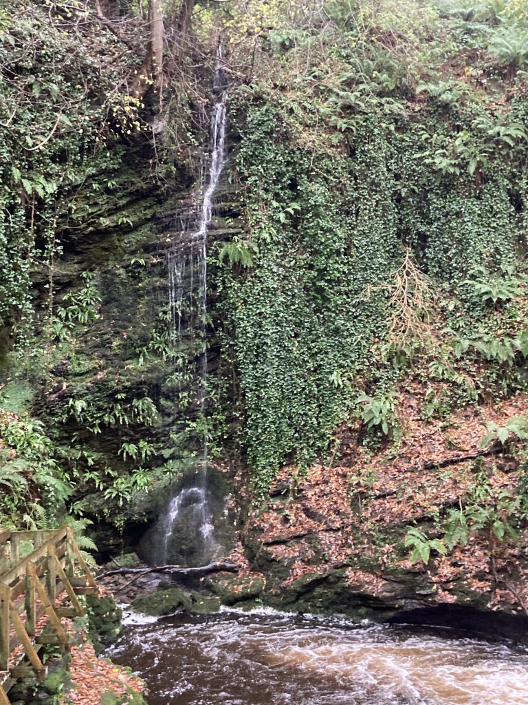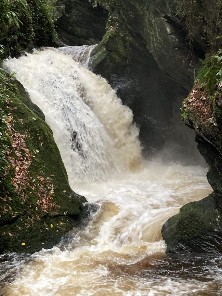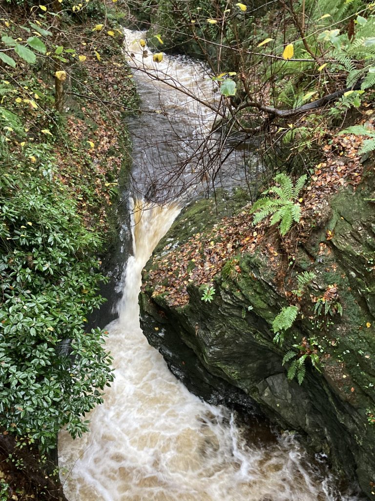 The autumn leaves lying on the path were beautiful. Most of the leaves had left the trees, leaving the canopy more open to the sky, and allowing the rain to tumble through more easily. This is only a short walk, gradually going uphill, and I could sense a build up of water as I heard the rush of water falling in the distance. Turning the corner, I was at the Glen Maye waterfall, looking resplendent and owning the place. I have never seen it so full of water and I stood there mesmerised watching it pounding down over the rocks and creating a misty haze over the pool. It was stunning. This was definitely the way to encounter the waterfall, starting low with expectation building up as I walked though the glen.
