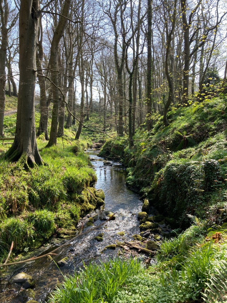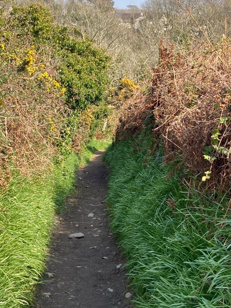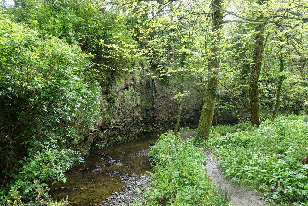 I parked at Tynwald Mills car park (St. Johns) and started my ascent immediately on crossing the main road from St Johns to Kirk Michael. There are two options here. Either follow the signpost for horses or take the left turn through the woods, which theoretically at least was the actual path. It was a delightful walk through the woods until it petered out at the stream, which meant I had a mini adventure making my way through the undergrowth in the trees to get to the top path (the horse path). It was fun anyway.