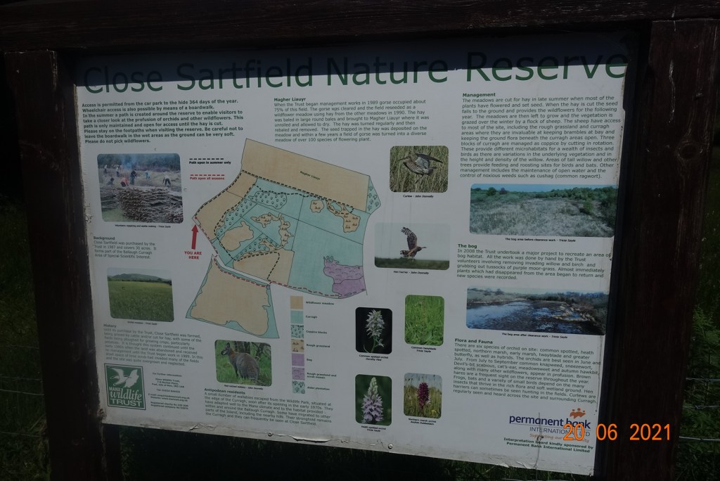 This reserve is in the north of the island, located in fields behind the Curraghs Wildlife Park, so you could easily combine this short walk with a visit to our local animal park. In both locations you may be lucky enough to spot the itinerant wallabies, who can now be seen lolloping around most of the countryside at some time or other. Much as they are appealing I believe they can also be a nuisance, as was explained to us by Tricia Sayle who manages the reserves. Whenever they spot a nice piece of grass they will find a way to reach it by grubbing up fences, which then make it possible for sheep to escape much to the consternation of the farmers. Apparently, the wallabies are too lazy to jump over fences! But much as with Covid -19, we have to learn to live with them.As it happens we didn’t see any today. We were pleasantly surprised to have a warm sunny day, given that the forecast had been for dull or even rainy weather. As it was, sunhats were in order.