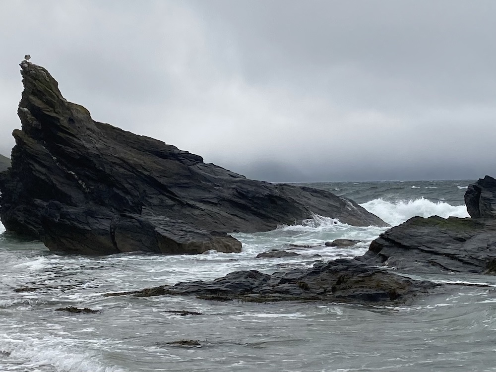Of course, it was too much of a draw to simply look at the views, so I took the cliff path round to White Sands Beach, almost getting blown off my feet as I walked around the headland. It was very very blowy, but even so very enjoyable. It is barely half a mile’s walk to this lovely bay, but there are some ups and downs and some steps so not entirely flat, so not a walk if you don’t like steps. I always enjoy spending time on this mostly pebbly beach, and the wind was whipping up the sea nicely, creating white horses buffing up against the rocks. I was amused to think that the large rock with the seagull perusing the shoreline looks aptly rather like a seal.