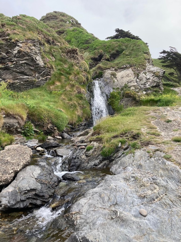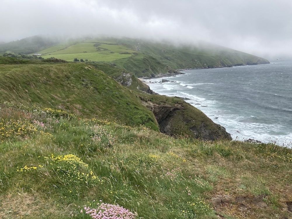 Where the path goes uphill there is a sweet waterfall. I did clamber up the rocks to see the fall higher up, but the photo was disappointing. You can tell it is often windy here as the trees lean in towards the rocks, as if they struggling to keep themselves upright. It isn’t long before you reach the top of the cliff. Make sure you keep to the coastal footpath as there is a private path to the left, now marked private. It is possible to continue walking around the coastpath, but the actual path then takes you over fields to join the track from Cronk Ny Array Laa to Dolby.