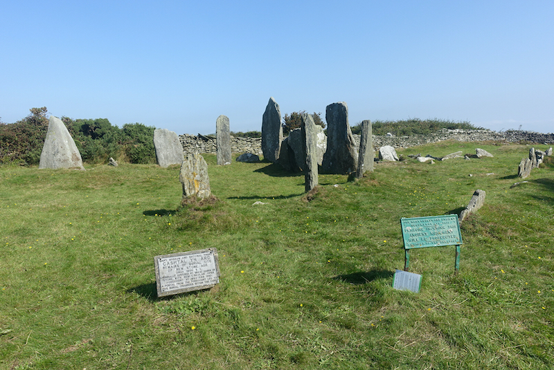 The route follows a minor road uphill for almost a mile until we take another even more minor road to the right which will ultimately take us off road for 300 metres to Cashtal Yn Ard (Castle of the Heights), a site of archeaological interest. It is a group of impressive standing stones that have stood here for the best part of 4000 years. It was originally a lot larger, one of the biggest megaliths in the whole of the British Isles, being 130 ft long, and containing 5 chambered cairns in a ‘horned barrow’. It is thought it may originally have been for a chieftain, and then over time it has become a communal burial ground for his lucky family. As with many of these ancient sites, one has to imagine it completely covered with turf and soil with a majestic entrance at one end, in this case, the west end where there still stands two mighty stones which would have been the archway into the inner sanctum.
