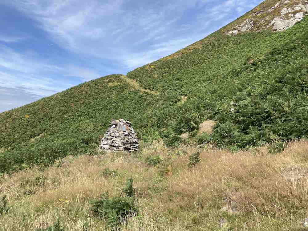 The family went off to Ramsey on the Millennium Way. I was a little early so decided to walk on a little and completed my descent at the Tholt-y-Will Iron Age Earthwork. This is a bank about 6ft wide, extending in both directions across the road for about 100 yards in each direction. It is thought to be a defensive rampart protecting the hill route between the two streams, but no-one really knows. At this point I had a call from Phil, the pilgrim, to say they were well behind and by the time they had had lunch it would be at least an hour. Big sigh, my end, but not surprised. I decided to start the walk without them, and if I walked slowly, they would eventually catch me up, so back up the road I went to join the Millenium Way. I was a little uncertain about doing this, as I have never been on this path, but hey ho, life is for living and having small challenges, so this was mine for the day.