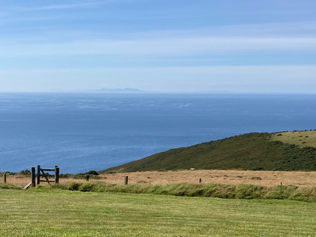 Once back on the track, I followed it to where it joins the path from the Mountain Hut. There is a large section of boardwalk here across the bogs. I had to wait for some very slow bikers to come over it before I could go. Nearing the far end, one of the boards gave way, which was a little alarming. Going through a gate, you then join a stony track that goes on and on and on for miles, all the way to Ramsey. It is uneven and as a descent, although not steep, it is tedious. The early part is fine and has lovely views to the north. Scotland was visible today. I had just joined this section when I saw a very colourful lone walker dressed in yellow coming towards me. As we converged, I was delighted to realise it was Paul the Pilgrim from Friday’s walk. He is such an interesting person and it was a delight to spent a further few minutes in conversation with him. He was intending to meet up with the group and walk with them for a while, but I had serious doubts whether he would succeed.