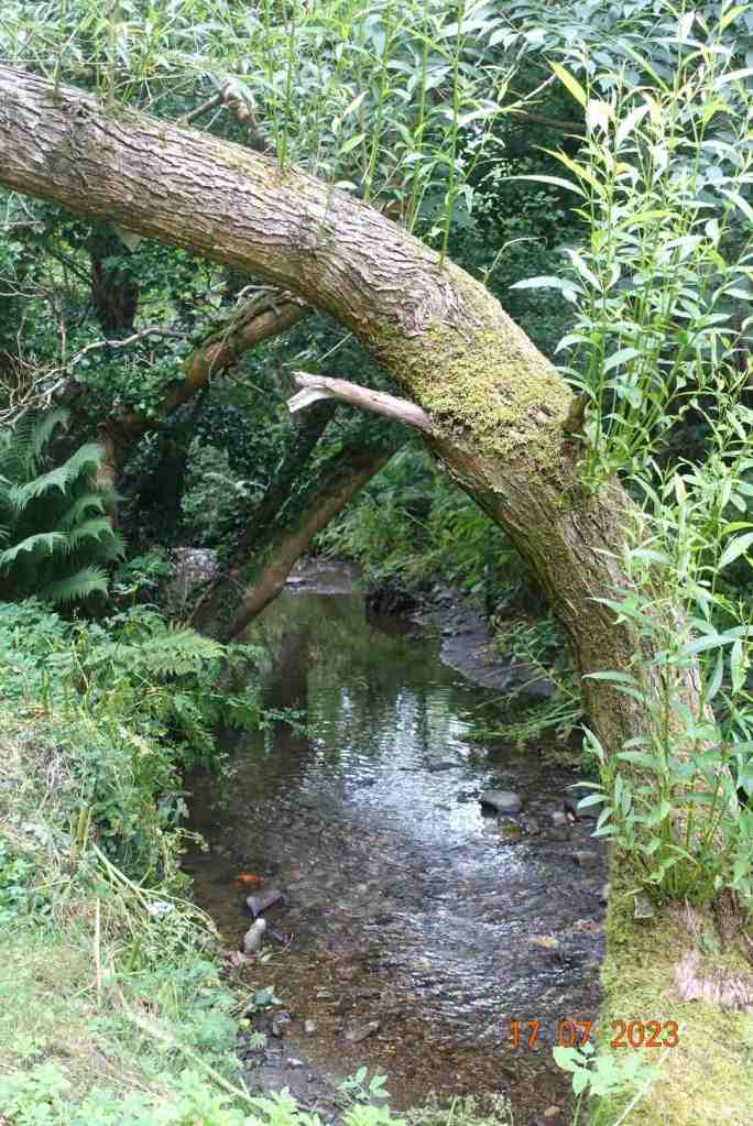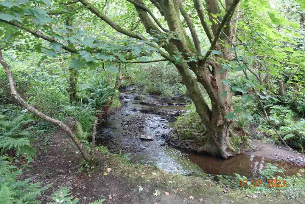 After from the biker I didn’t see a single soul, not even in the distance. The ridge walk is only short, about 2 miles, though on another day you could take in Colden to extend time at the top. After Greeba Mountain, the only sensible way down in through the forest. The descent is not great. It looks as if the path has been ‘repaired’ but it is full of small stones of different sizes and the gradient is quite steep, so this was not particularly pleasant. Far easier to walk on the heather, but I didn’t do this. I was glad to reach the edge of the forest after about 15 mins. This is then a very pleasant walk on soft turf in the quiet eeriness of the forest. I had made the decision that I would take a detour from the forest and cross the small stream and follow an old road back to Crosby. I enjoyed the stream – it was in full pelt and there were some stepping stones which were fun to cross. It is a permissive path, but obviously well used.