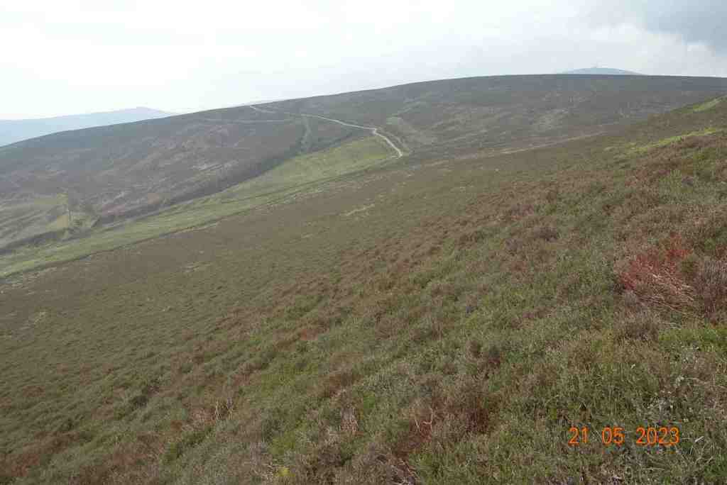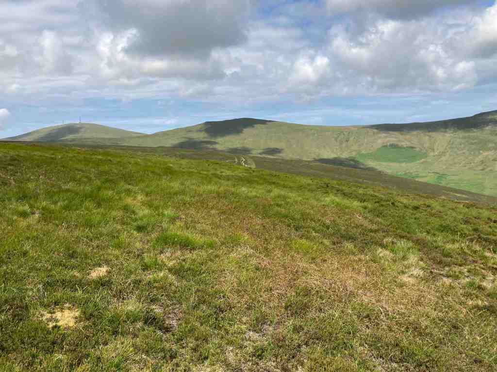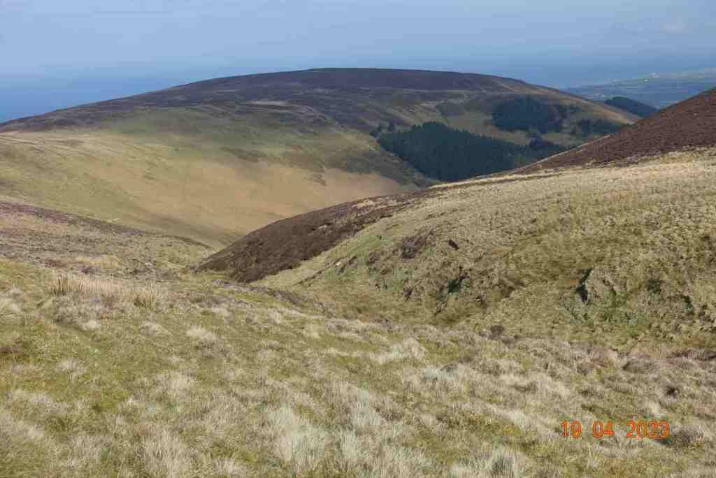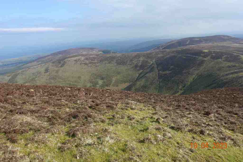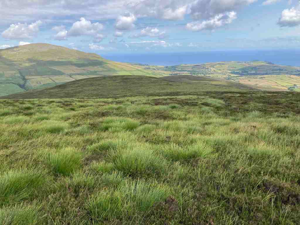 The steady climb continues until you reach a false summit with a cairn, but it isn’t actually at the top, so it more of a waymarker. However, as you climb, the vista begins to open up especially to the south and east and you get good views of Maughold as well as distant views to Douglas and beyond. You can imagine in your mind’s eye the Creg Ny Baa (rock of the cow !?) and the mountain road to the south of Windy Gap. After Slieau Ruy there is a plateau of heather and grass before another short climb up to Slieua Ouyr (yes, you guessed it – ouyr means yellow, as in ochre). It is worth heading off the path a little to the north to get the best views of the Corany Valley and Ramsey. You cannot miss the sausage shape of the North Barrule hills which dominate this landscape. It was at this point I needed to hunt for a new path, and find one I did. It leads down to the gap between Slieau Ouyr and Slieau Lhean (meaning broad and long). The map indicates there are cairns but I didn’t see any. This is a watershed where one half flows down into the Laxey valley and the other half flows into the North Laxey Mine area. There is a faint path going up Slieau Lhean but I gave this a miss, in favour of a wide, grassy track to the north, which eventually joins the Glen Mona track. Distances are so deceptive; hills look to be a stone’s throw away yet take an age to go round or over them.