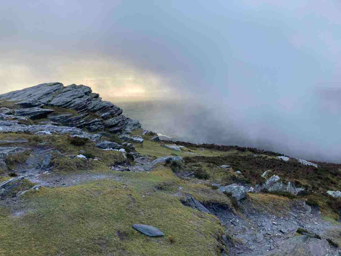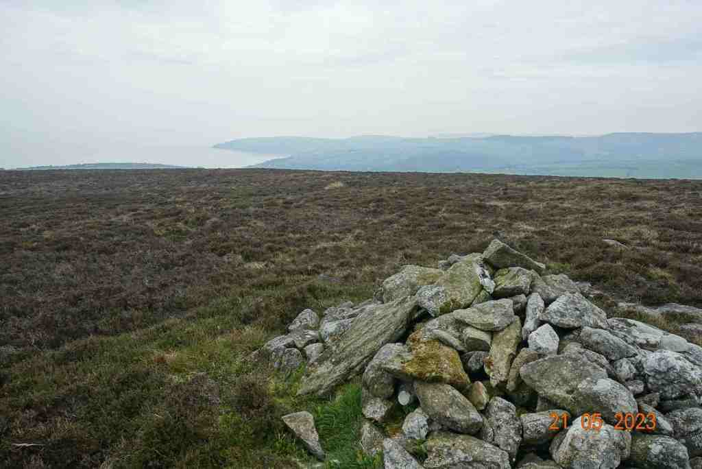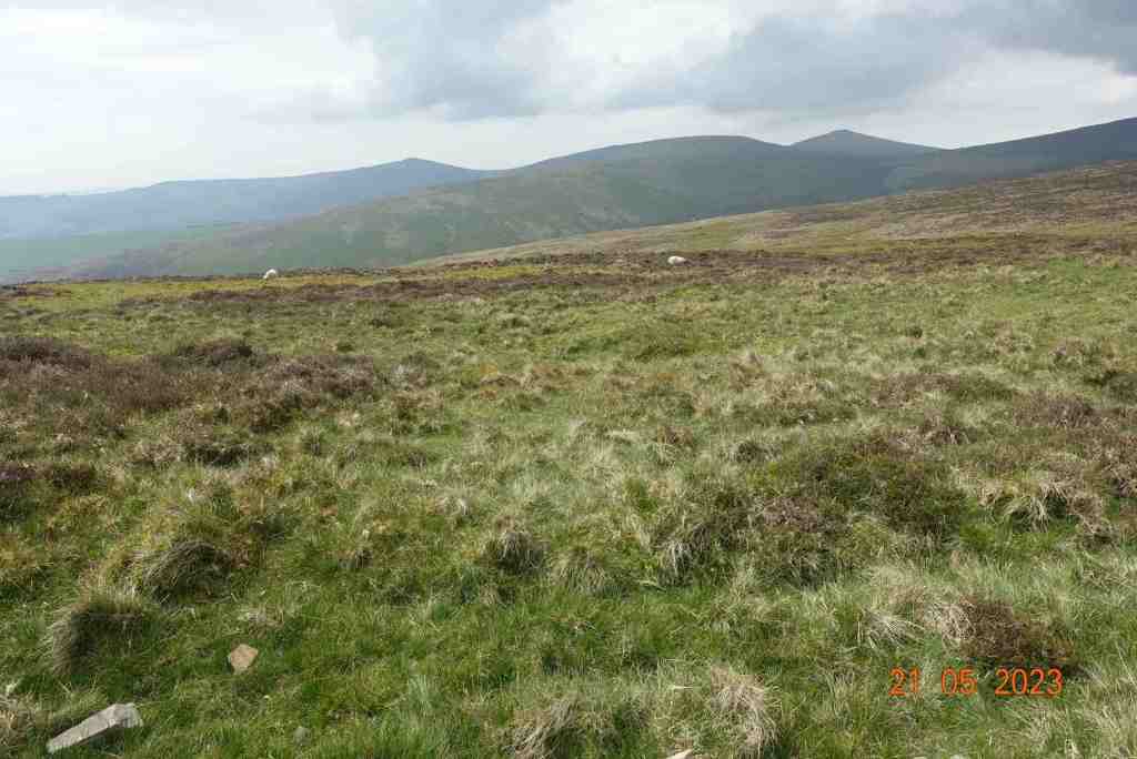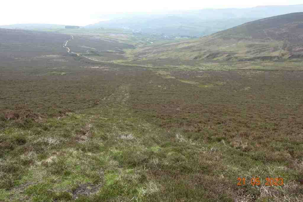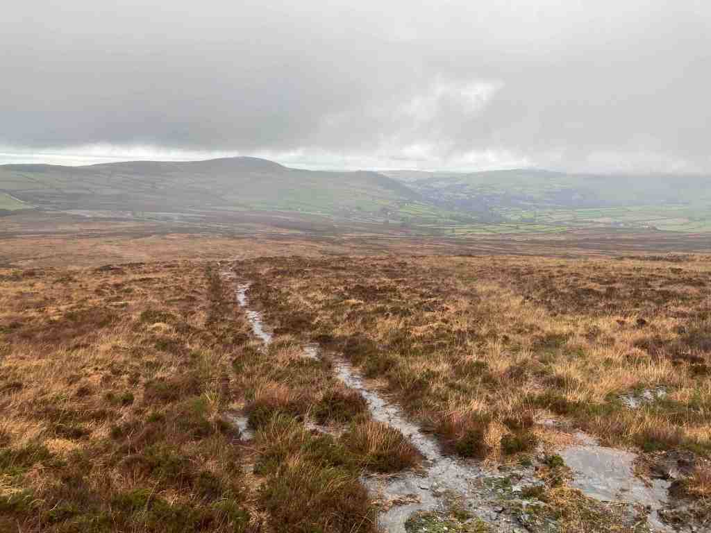 The steady climb continues until you reach a false summit with a cairn, but it isn’t actually at the top, so it more of a waymarker. However, as you climb, the vista begins to open up especially to the south and east and you get good views of Maughold as well as distant views to Douglas and beyond. You can imagine in your mind’s eye the Creg Ny Baa (rock of the cow !?) and the mountain road to the south of Windy Gap. After Slieau Ruy there is a plateau of heather and grass before another short climb up to Slieua Ouyr (yes, you guessed it – ouyr means yellow, as in ochre). It is worth heading off the path a little to the north to get the best views of the Corany Valley and Ramsey. You cannot miss the sausage shape of the North Barrule hills which dominate this landscape. It was at this point I needed to hunt for a new path, and find one I did. It leads down to the gap between Slieau Ouyr and Slieau Lhean (meaning broad and long). The map indicates there are cairns but I didn’t see any. This is a watershed where one half flows down into the Laxey valley and the other half flows into the North Laxey Mine area. There is a faint path going up Slieau Lhean but I gave this a miss, in favour of a wide, grassy track to the north, which eventually joins the Glen Mona track. Distances are so deceptive; hills look to be a stone’s throw away yet take an age to go round or over them.
