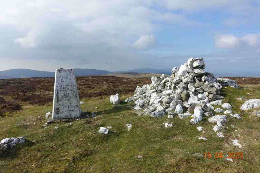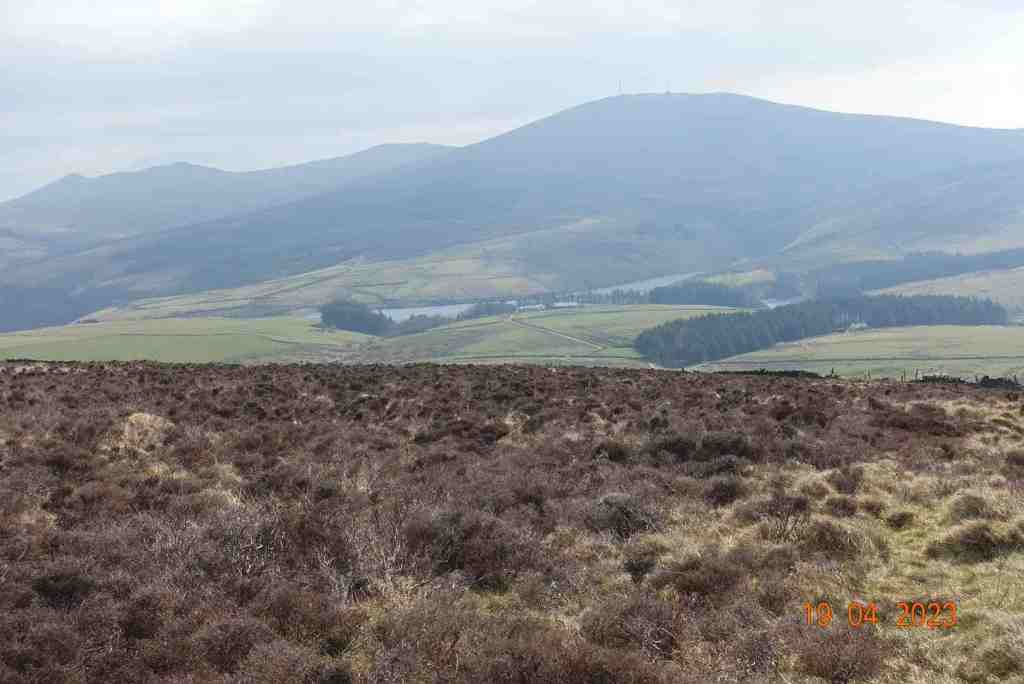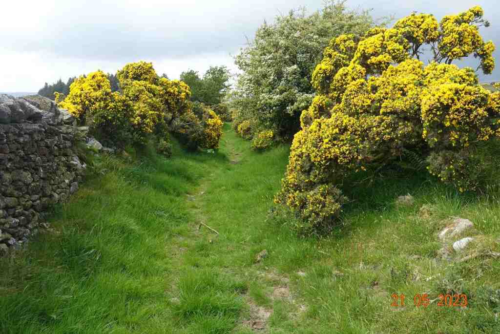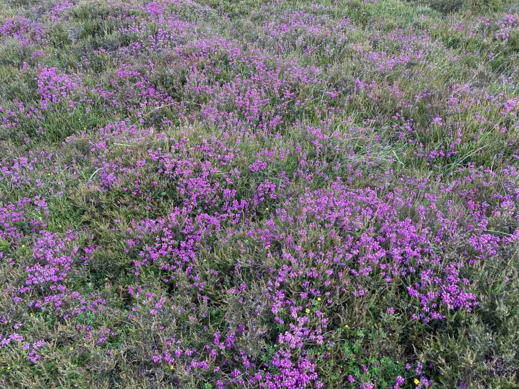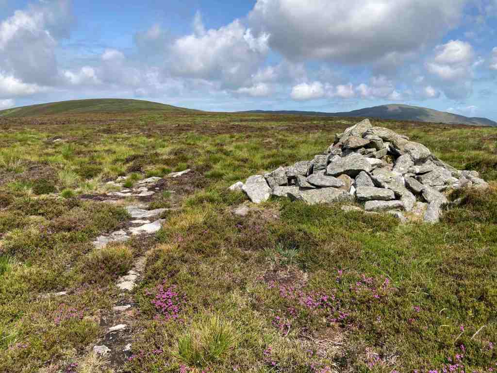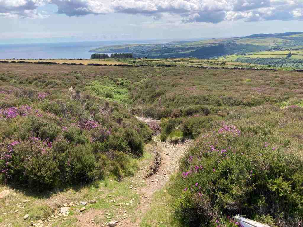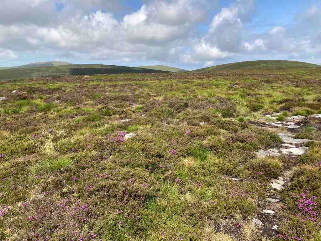 It was a bright sunny day, a change from the unremitting dull weather we have been having recently. Yes, I know, we had no rain for 5 or 6 weeks so we need some bad weather in between the good weather. It is a very gentle, steady climb once on the lane that goes nowhere, other than to a few houses and farm buildings. The lane stops abruptly at a field gate where it turns into a green lane, which means bikes and horses can use them. This is good in one way as it opens up the countryside to various forms of locomotion, but the bikes certainly mess up the tracks and pathways too. The track enters ‘The Dreem’, the Manx word for the back of a hill. After about half a mile, the eagle-eyed person will spot a tiny footpath leading off up the hill to Slieau Ruy (396m). We have several hills with this name and despite sounding regal it only means ‘red’, but in this case, it means the red of the purple heather, which was already flowering. I have never seen so much heather this early on in the summer.