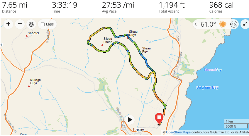 That was it for today. I should just mention that although not a difficult walk, there is far more uphill walking (just under 1,200ft) than if you walk it the other way round, from Snaefell. As I was finishing the walk a holiday organiser rang me to confirm that I had got the last possible space on a train trip to Austria. I was so delighted I didn’t re-check my diary and managed to book myself on a wonderful holiday at precisely the same time as I was due to lead the Southport group on their walks. When I realised this I was devastated, but I am sure it will all work out. I can at least do one day with them. How ironic is that when you think I had gone out today specifically to recce a walk for them. That momentous birthday that crept up on me last week may be signalling a faster deterioration in my mental abilities than I am aware of!!!