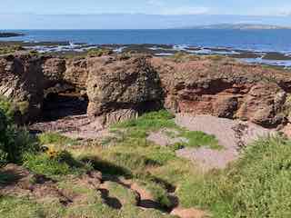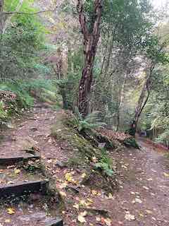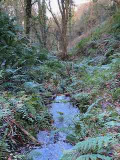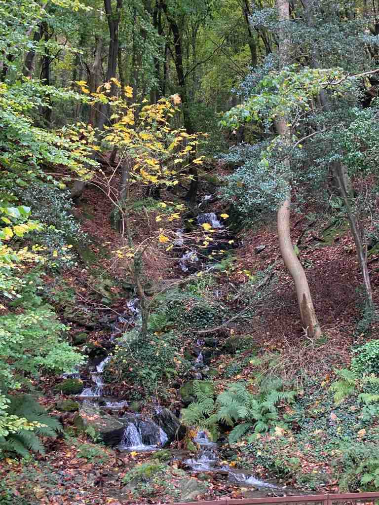 Ladygrove woods are mostly beech and you can imagine the beautiful colours on the paths carpeted with leaves. The first ‘reservoir’ is visible, but the path thereafter goes high above other waterscapes, so the others are barely visible. The path is narrow and a little uneven and every now and again you have to jump over a small stream. There was a lot of water in these streams given that is hasn’t rained for some time. The other surprise were some boulders and cliffs, looking very similar to Charnwood Forest. Presumably, these have been quarried but I don’t know the history of this area.