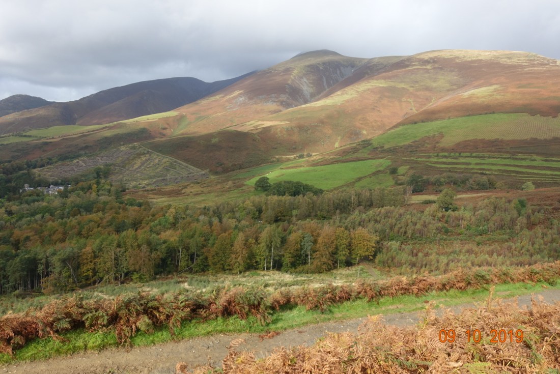 On the map it is easy to miss the amount if ascent on this road as it circumvents the lower reaches of Skiddaw with it bronze ferns and grasses. By contrast, on the other side of the road were managed green fields and a steep wooded gully, every now and then broken by tiny rivulets insisting on joining the main stream. The steepest section covered a distance of about 1/3 mile (1/2 km) with a climb of 328 ft (100 metres), the steepest section being just before the car park. I must admit I huffed and puffed up that bit, but then I am full of cold/flu so perhaps that’s not surprising.