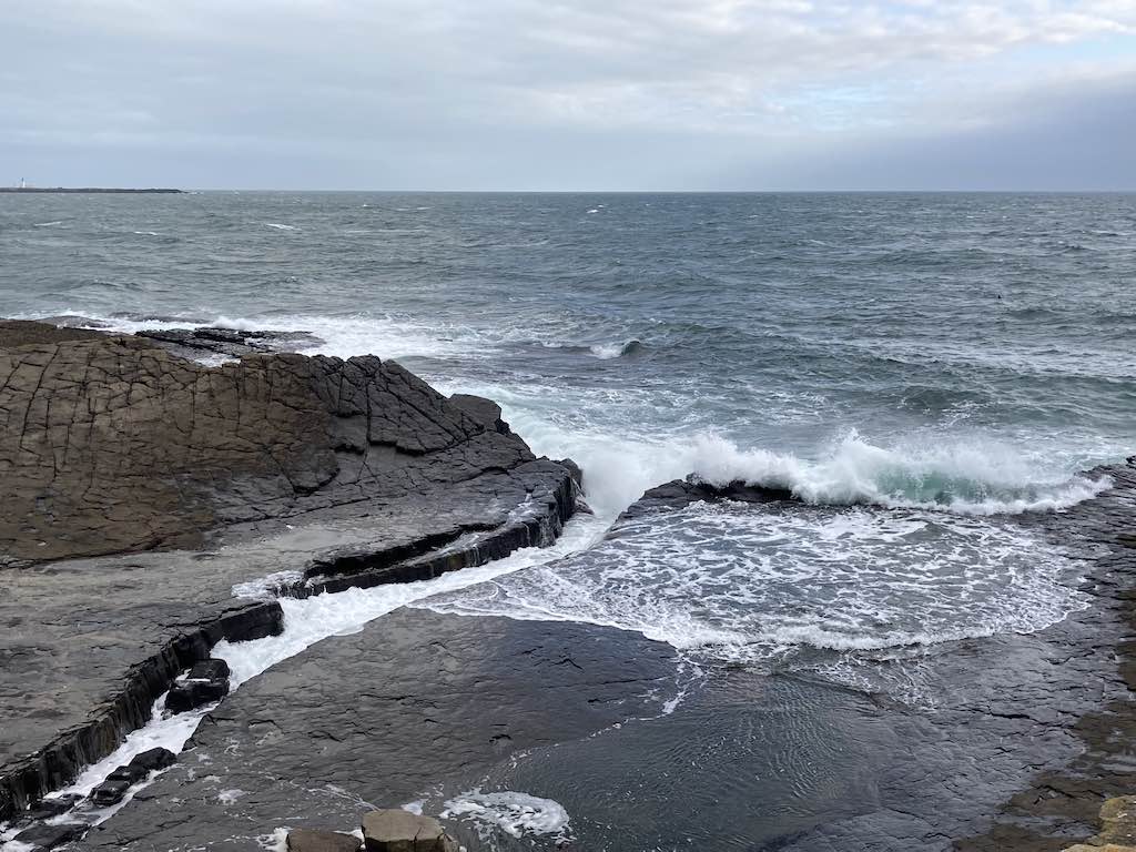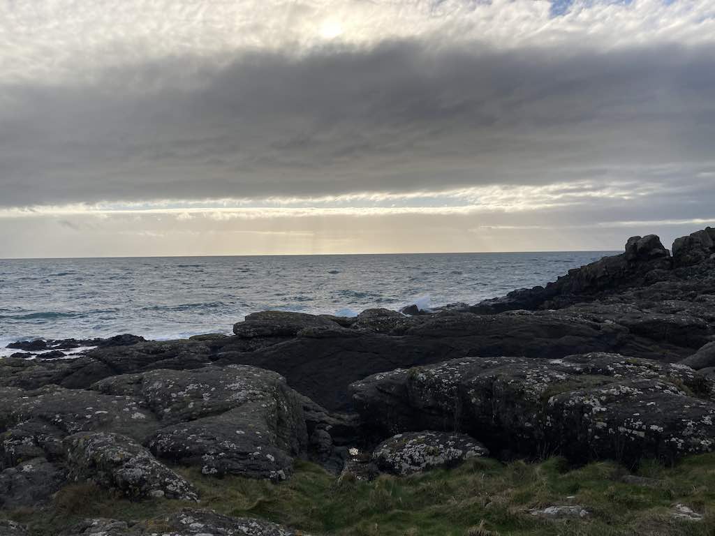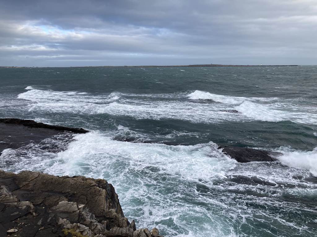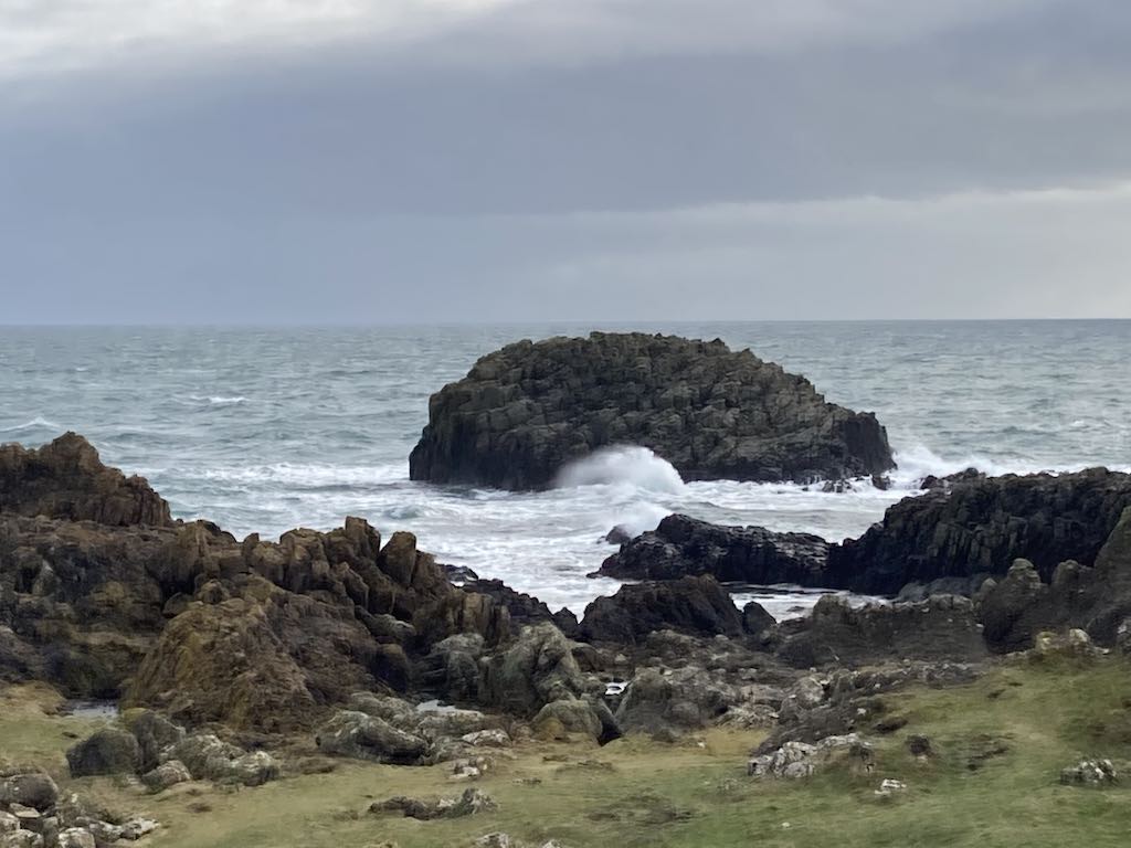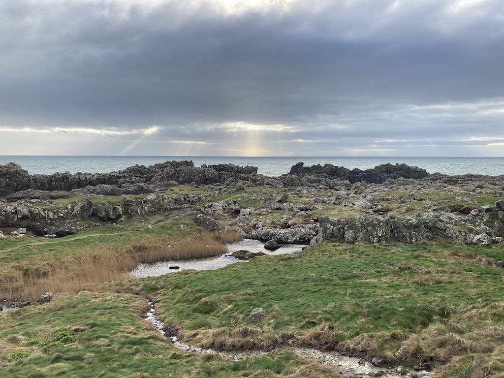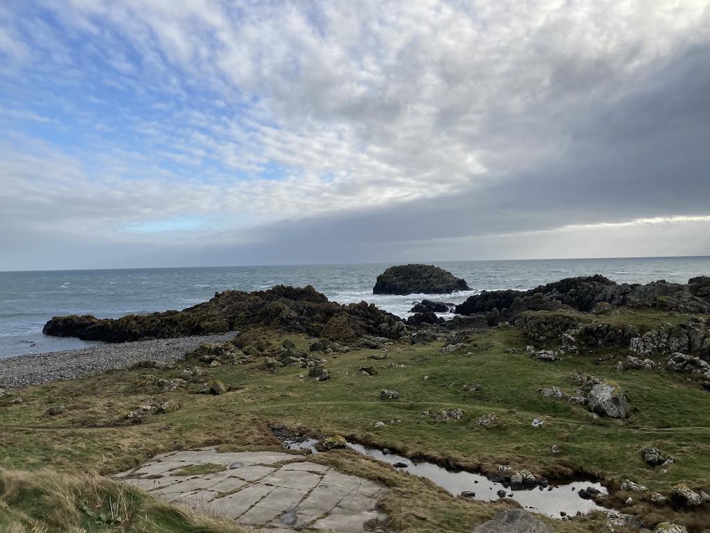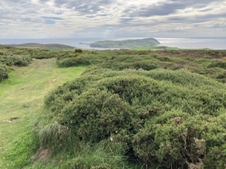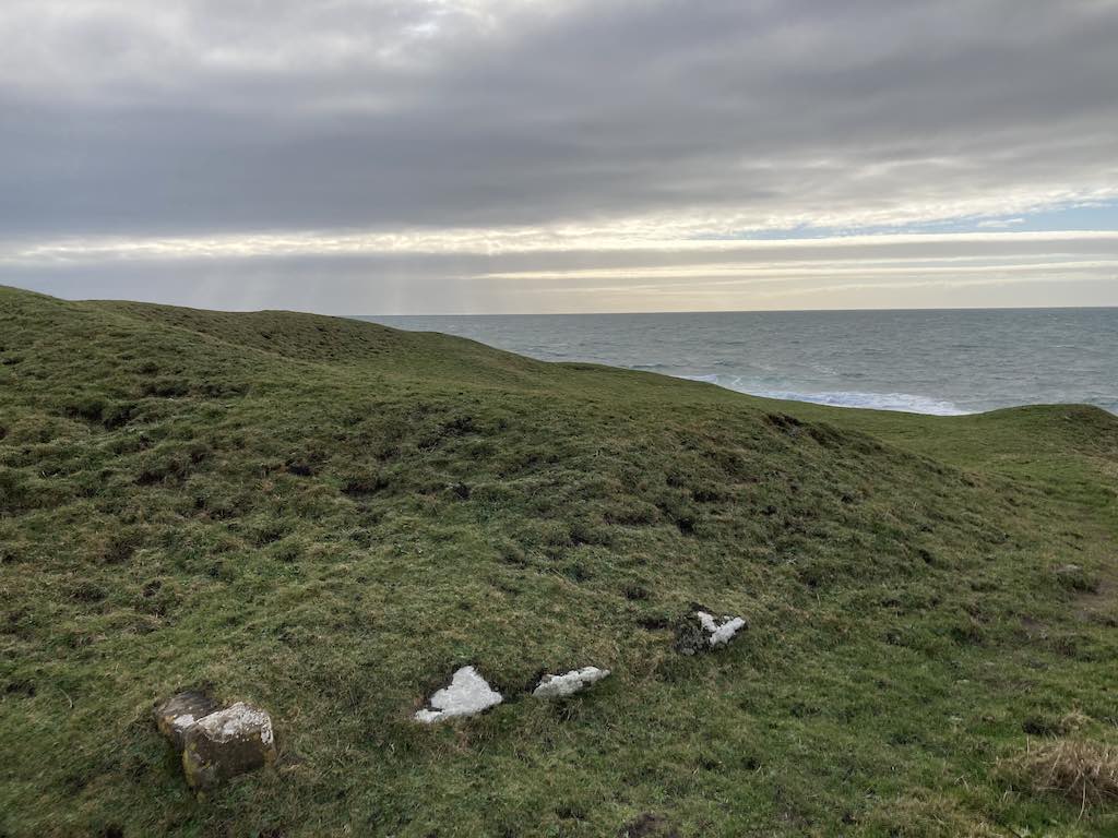 The eastern side has a different feel to the western side. The terrain is soft underfoot with more varied rocks landward and more gullies with sharp upright rocks on the seaward side. There is gorse and heather setting off the herring tower, and as you walk the mile or so towards the golf clubhouse you get amazing views of the range of hills all the way from Bradda Head to North Barrule. The path eventually goes onto the golf course itself, so keep towards the edge. There is plenty of room to walk beside the course rather than on it. However, to get to the clubhouse you do need to cross it for about 50 yards, so watch out for flying balls.