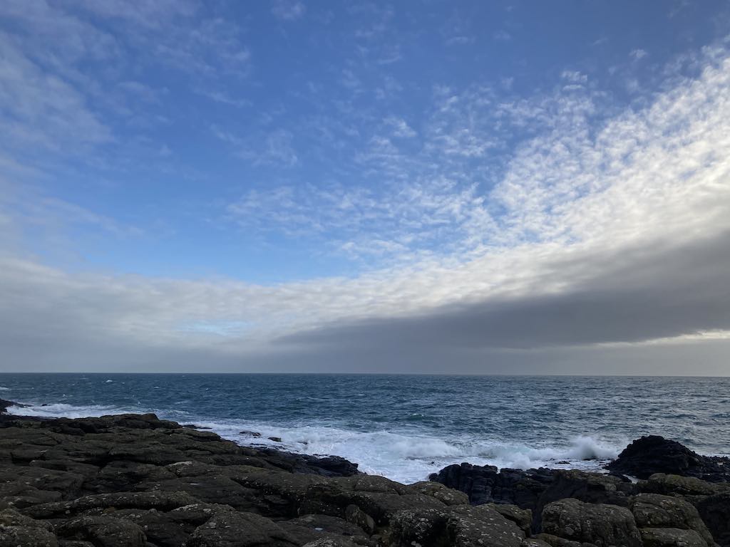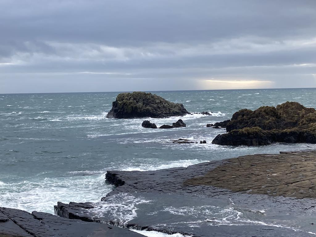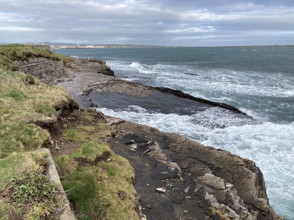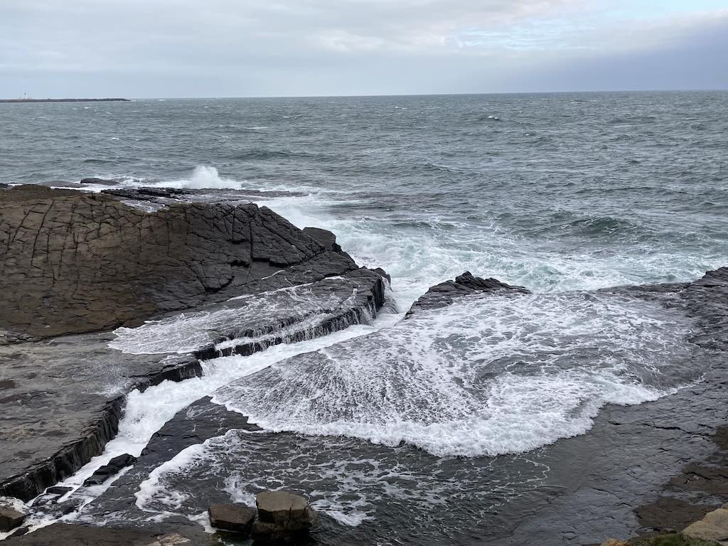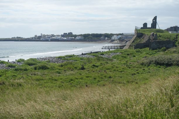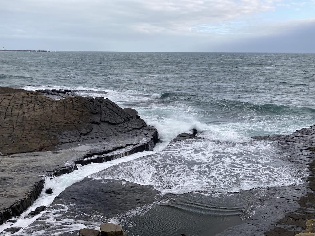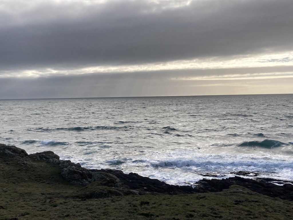The eastern side has a different feel to the western side. The terrain is soft underfoot with more varied rocks landward and more gullies with sharp upright rocks on the seaward side. There is gorse and heather setting off the herring tower, and as you walk the mile or so towards the golf clubhouse you get amazing views of the range of hills all the way from Bradda Head to North Barrule. The path eventually goes onto the golf course itself, so keep towards the edge. There is plenty of room to walk beside the course rather than on it. However, to get to the clubhouse you do need to cross it for about 50 yards, so watch out for flying balls.