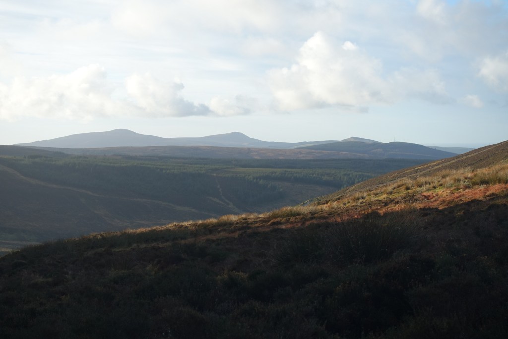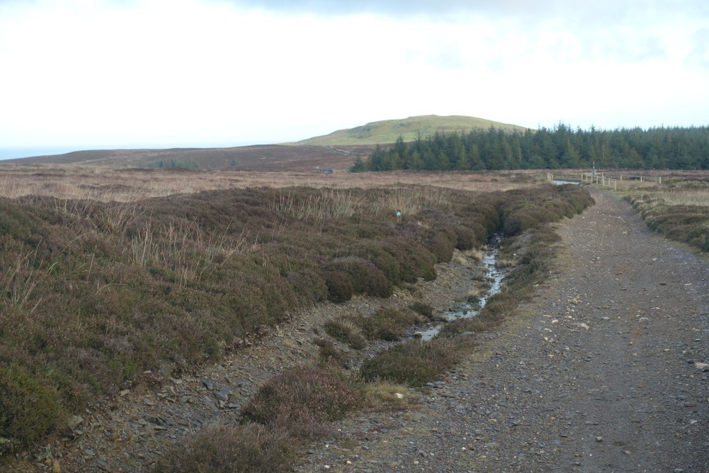 The walk follows a stony track gently and very gradually uphill contouring round the eastern side of Sartfell. There’s a deep plantation to the right to begin with prohibiting any distant views, but as you get a little higher, the trees become a little sparser and you get glimpses of a far distant land. Being so windy, the trees were making a heck of noise, sounding like gushing water or labourers felling trees, but no such thing was going on; it was just very windy.