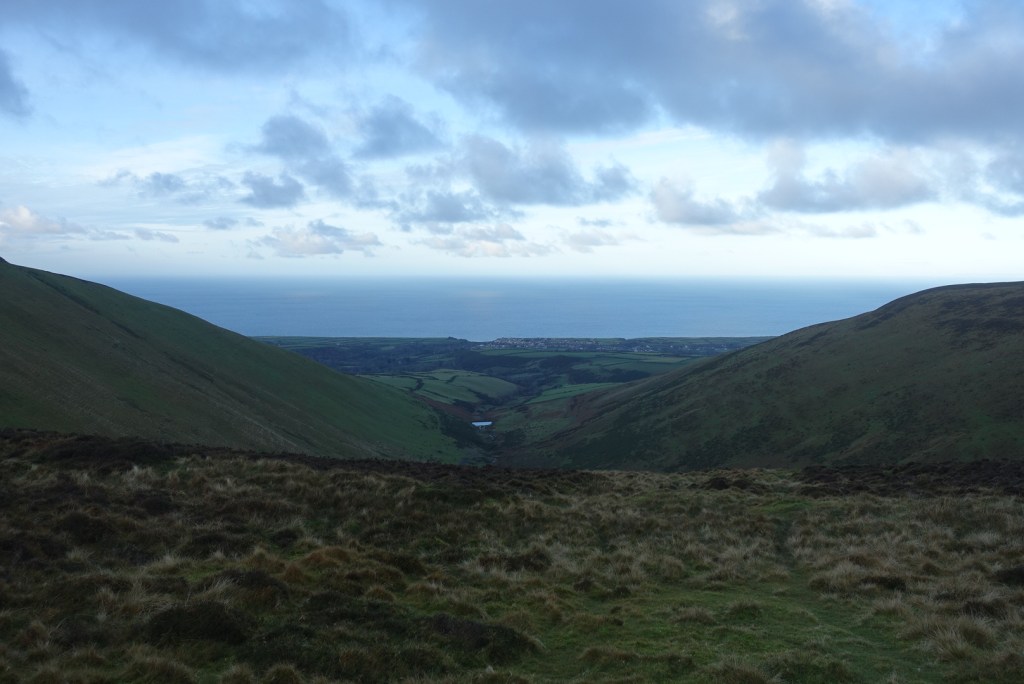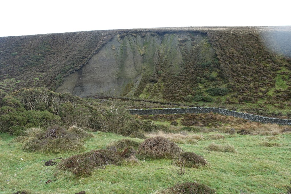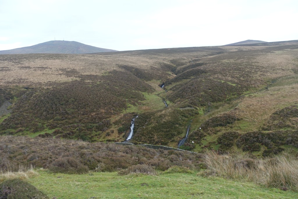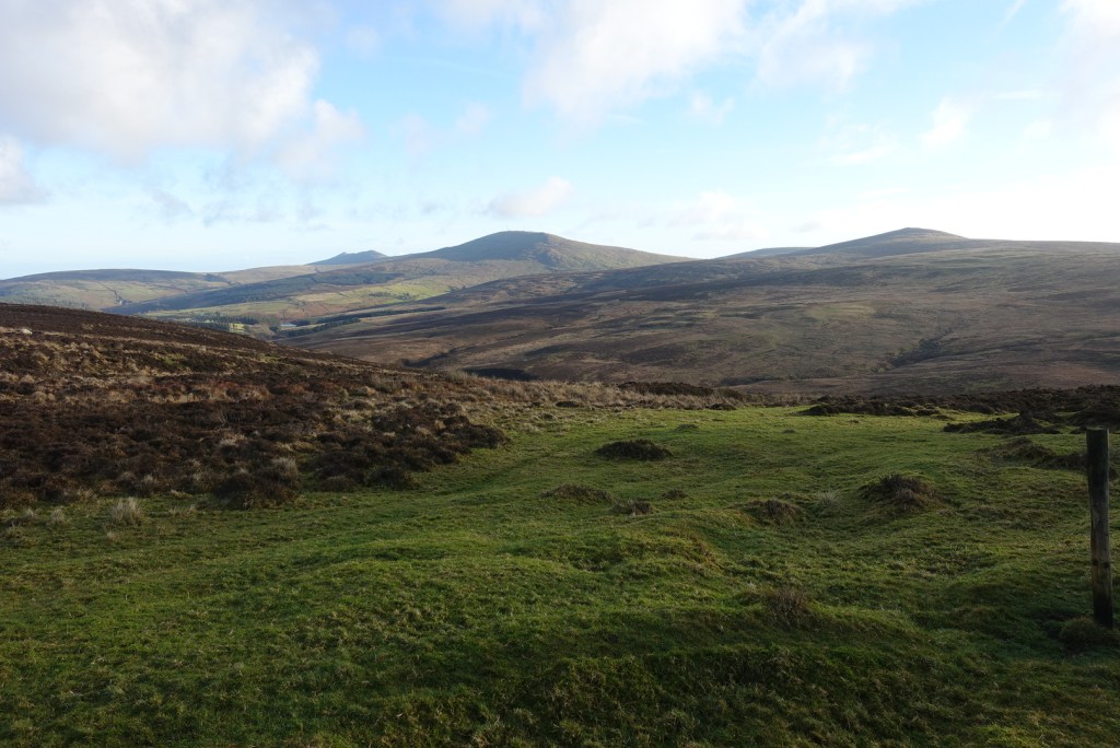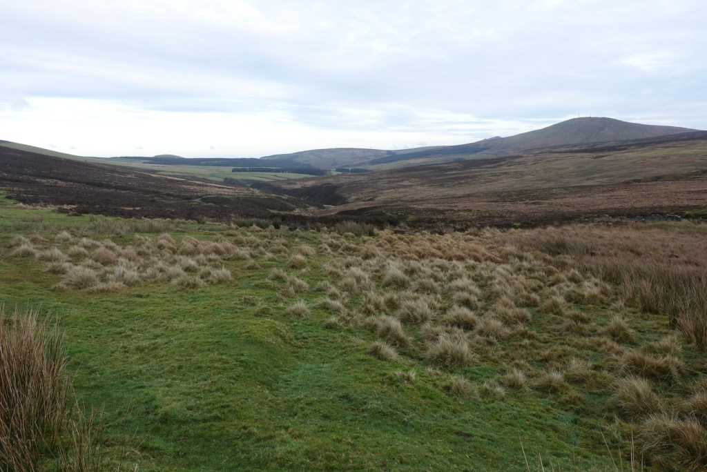 Once you leave the trees behind you are granted a full vista of the northern hills, with Sulby reservoir in the dip. It is still not possible to see over the hills to the east at this point. The stony track continues and becomes flatter. In the distance you can make out an old tumble-down wall on the right and that was where I was heading for. The map showed a foothpath up Slieau Freoaghane. It is a gentle hill climb from this starting point, on a well trodden path over mostly peat and heather. It is only when you reach the grassy top that you get the amazing views in all directions. At the trig point, there is a bell which I was very tempted to ring, but I managed to control myself, fearing that I might otherwise summon all the emergency services for no good reason. Reading someone else’s blog, this bell has not always been on the summit, but may have been linked to worker’s cottages lower down the hillside, and the bell was rung to signal the beginning and end of shifts – day and night. My walk was not going in this direction.
