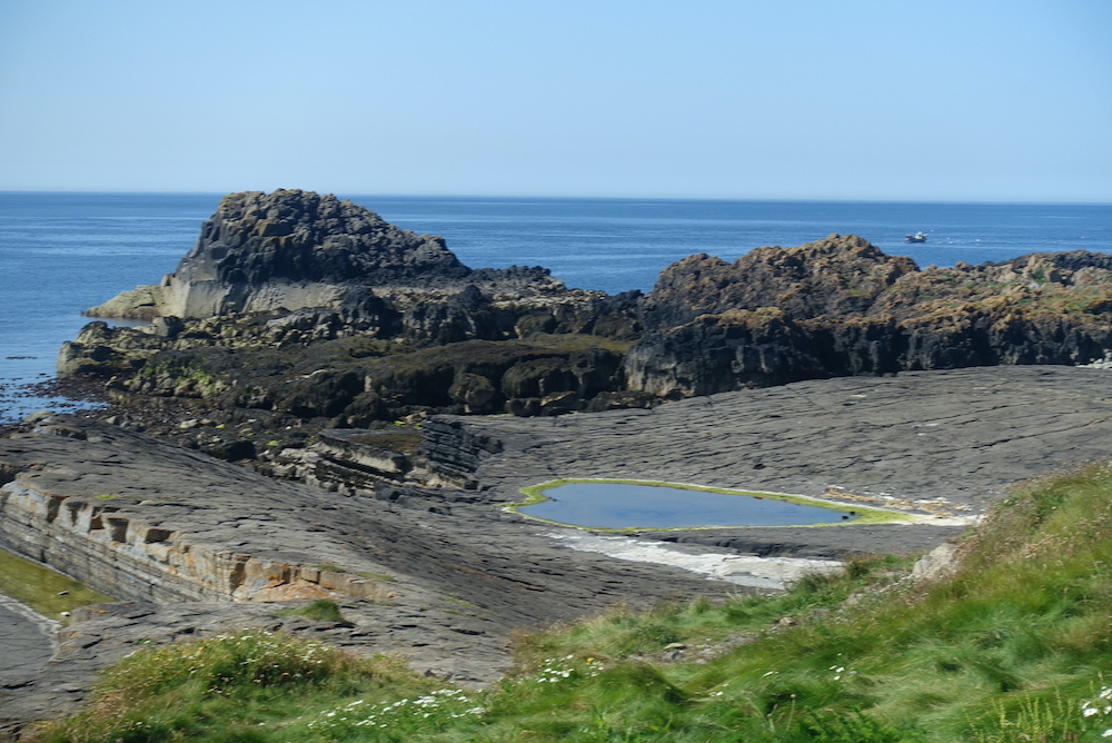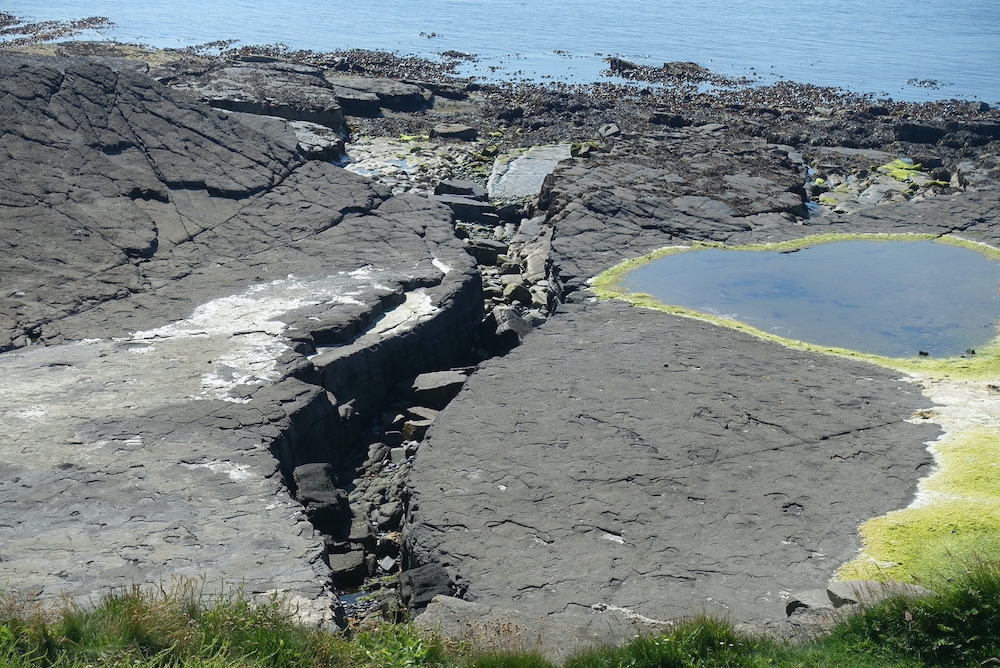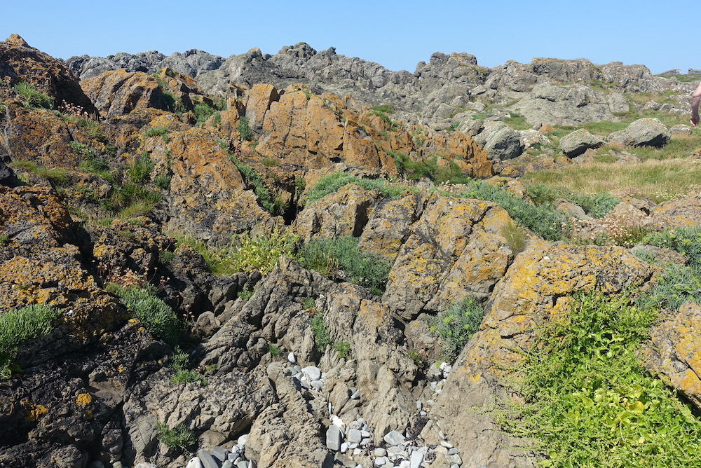 Just while he was explaining all this a pod of dolphins decided to give us a performance, so he lost most of his audience for a while as they leapt about in the water. In any case, it was time to go. It was such an interesting morning, and it has inspired me to look into the geology in more detail. The photos aren’t great, but at least it shows the Risso dolphins were there. And I finish with a peaceful view inland from this same spot.